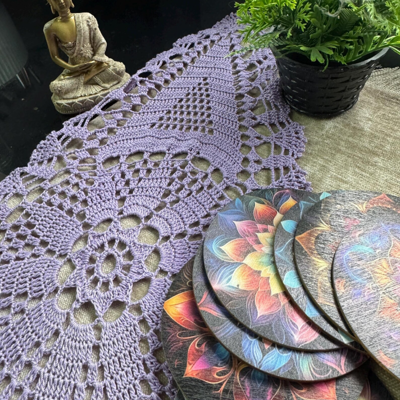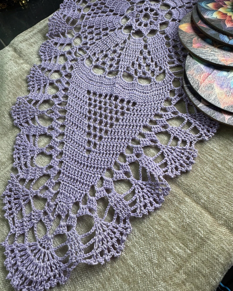 Technische Daten: Handgehäkelter Tischläufer in Flieder.