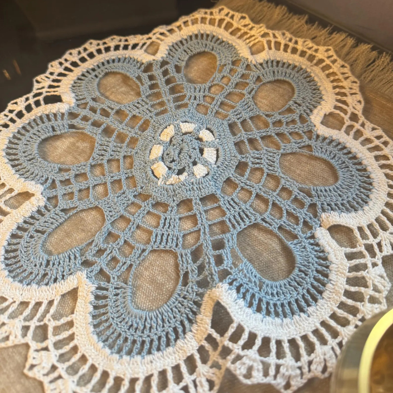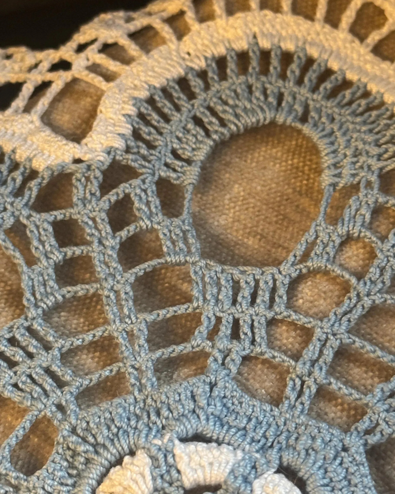 Rundes Häkeldeckchen – Spitzen Naturweiß & Hellblau